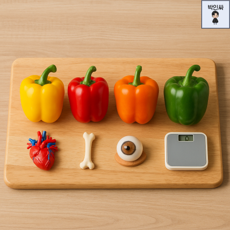 파프리카는 비타민C가 풍부해 면역력을 높이고 감기 같은 질병 예방에 도움을 줘요. - 눈 건강 보호