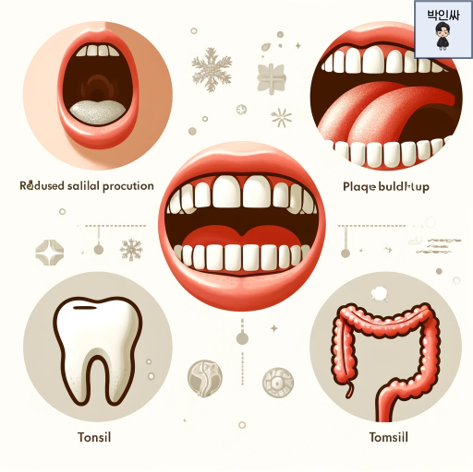 - 목 안쪽 편도에 흰색 알갱이가 생길 때, 특정 구취가 발생하기도 합니다.